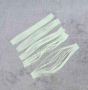 Super Glow Silicone Legs from Fisher Tackle. The legs are approximately 6″ long with a band on each end. 20 strands per piece.